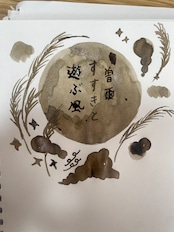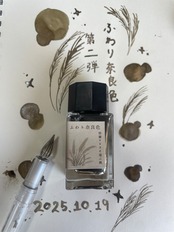 「曽爾すすきと遊ぶ風」は、光と風をイメージしたグレージュ(グレーxべージュ)の染料インクです。ほんのり温かみを帯びた灰褐色の中に、繊細なシルバーラメが瞬き、紙の上で秋の風景が静かに息づきます。